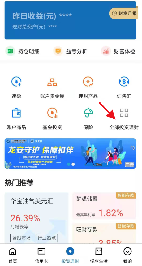 第一步:登陸建行手機(jī)銀行,在手機(jī)頁(yè)面最下冊(cè)中間位置,找到“投資理財(cái)”
